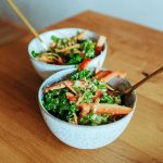 Vložte fazolové lusky do sekáčku nebo robotu a 5krát pulzujte, abyste získali nasekanou texturu. Přendejte do misky a stejný postup opakujte u kešu oříšků. Smíchejte kapustu, mrkev, papriku, koriandr, jarní cibulku, fazolové lusky a kešu.
